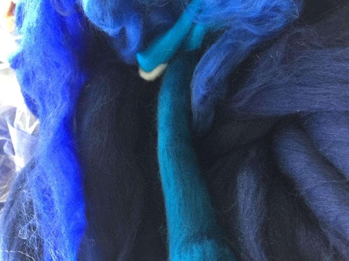 Ik zie een grote werktafel, een flinke machine om te vilten en manden vol met de mooiste kleuren wol.